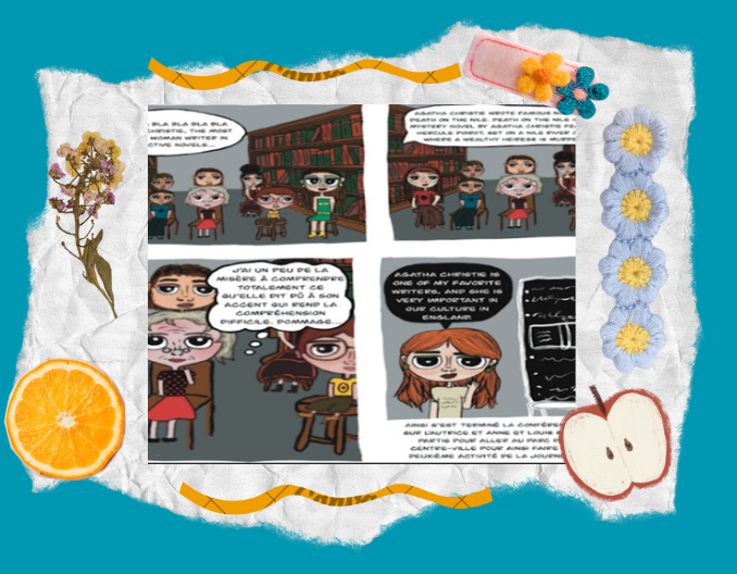 Anne et Louis assistent à une conférence littéraire consacrée à la célèbre autrice de romans policiers Agatha Christie. La conférencière s'exprime en anglais pour présenter des œuvres marquantes comme Mort sur le Nil et expliquer l'importance culturelle de l'autrice en Angleterre.